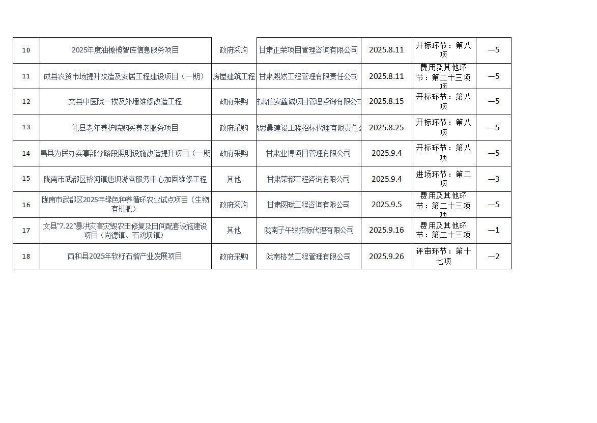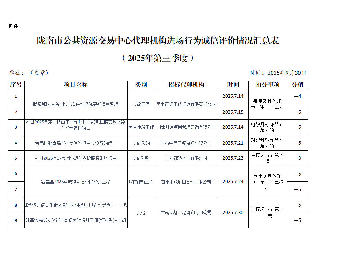 根據《隴南市公共資源交易中心代理機構進場行為誠信評價實施制度(試行)》規定,現對2025年第三季度共15家代理機構18條進場行為誠信評價記錄予以通報(詳見附表)。請各代理機構嚴格遵守各項規章制度、誠實守信,規范操作,為招標人和采購人提供專業、高效、規范的招標代理服務。