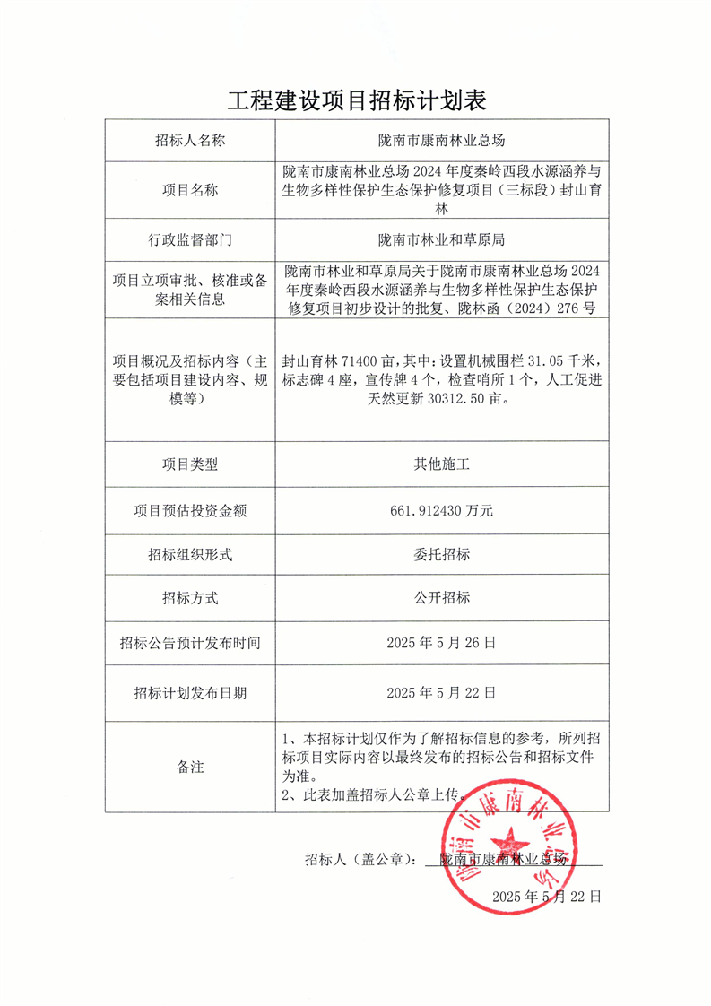 隴南市康南林業總場2024年度秦嶺西段水源涵養與生物多樣性保護生態保護修復項目(三標段)封山育林