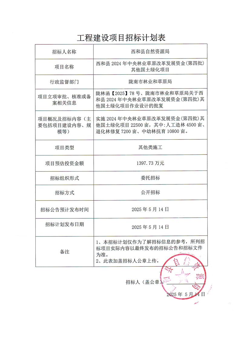 西和縣2024年中央林業草原改革發展資金(第四批)其他國土綠化項目