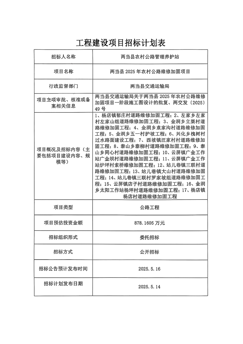 兩當縣2025年農村公路維修加固項目