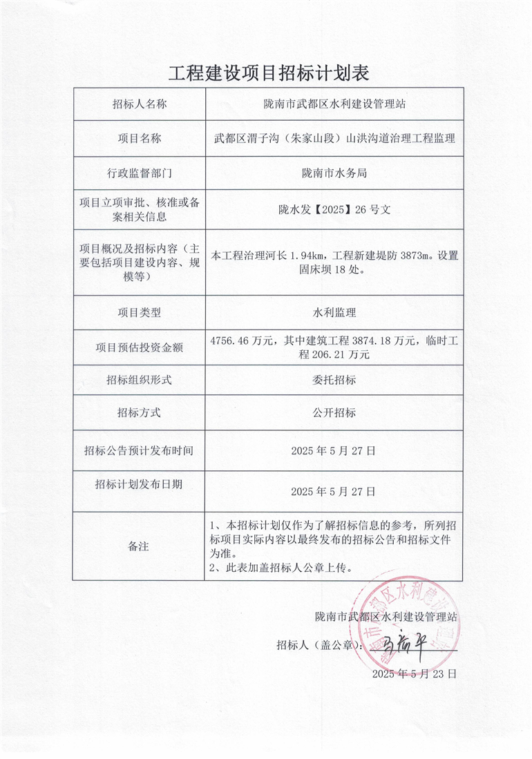 武都區渭子溝(朱家山段)山洪溝道治理工程監理