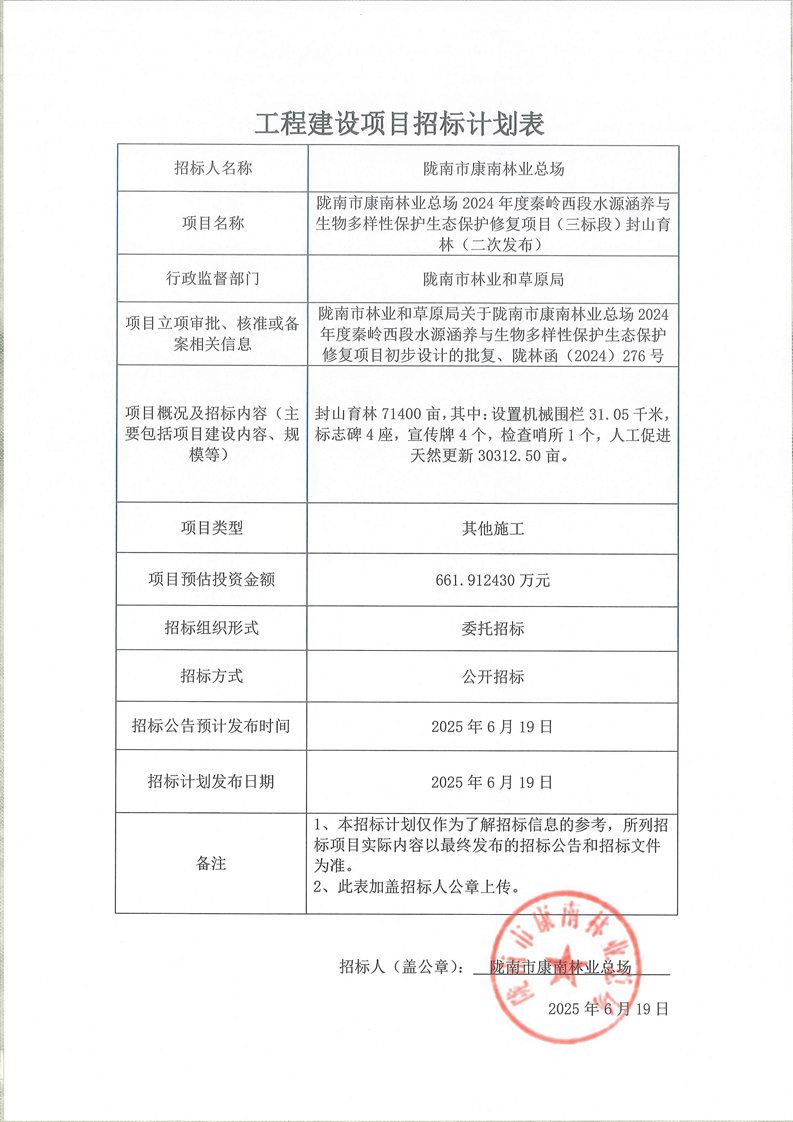 隴南市康南林業總場2024年度秦嶺西段水源涵養與生物多樣性保護生態保護修復項目(三標段)封山育林(二次發布)