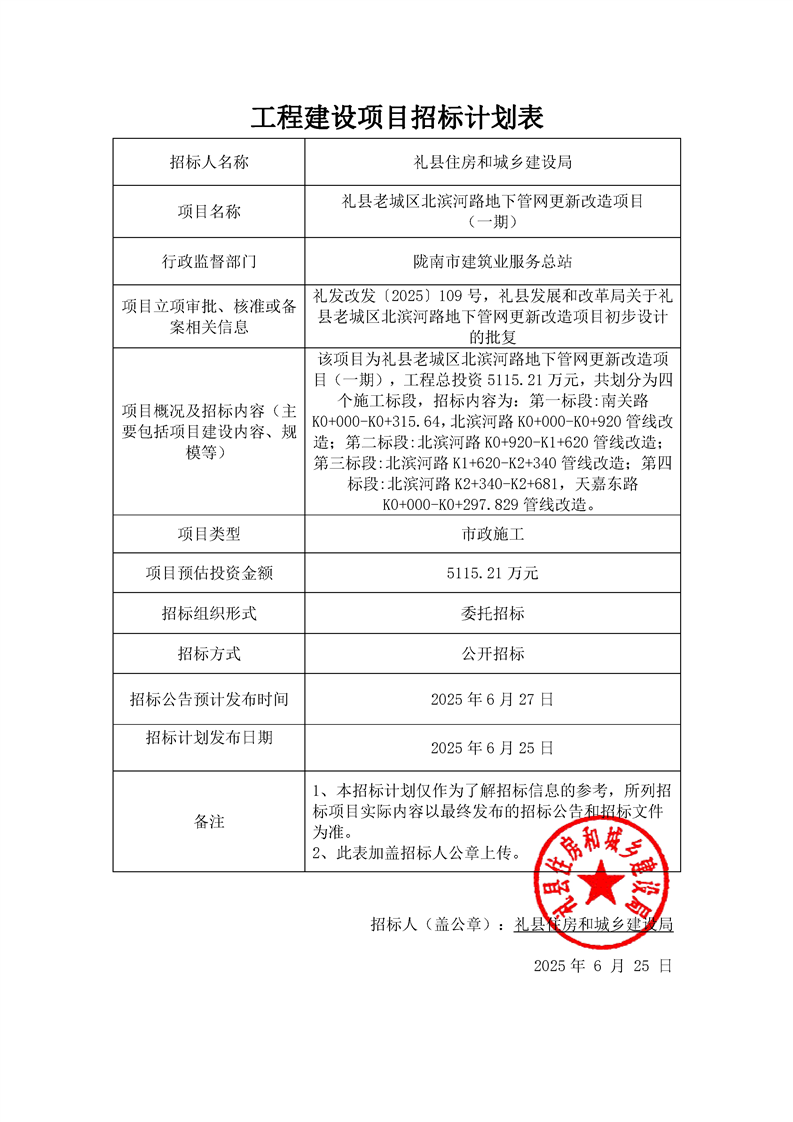 禮縣老城區北濱河路地下管網更新改造項目(一期)