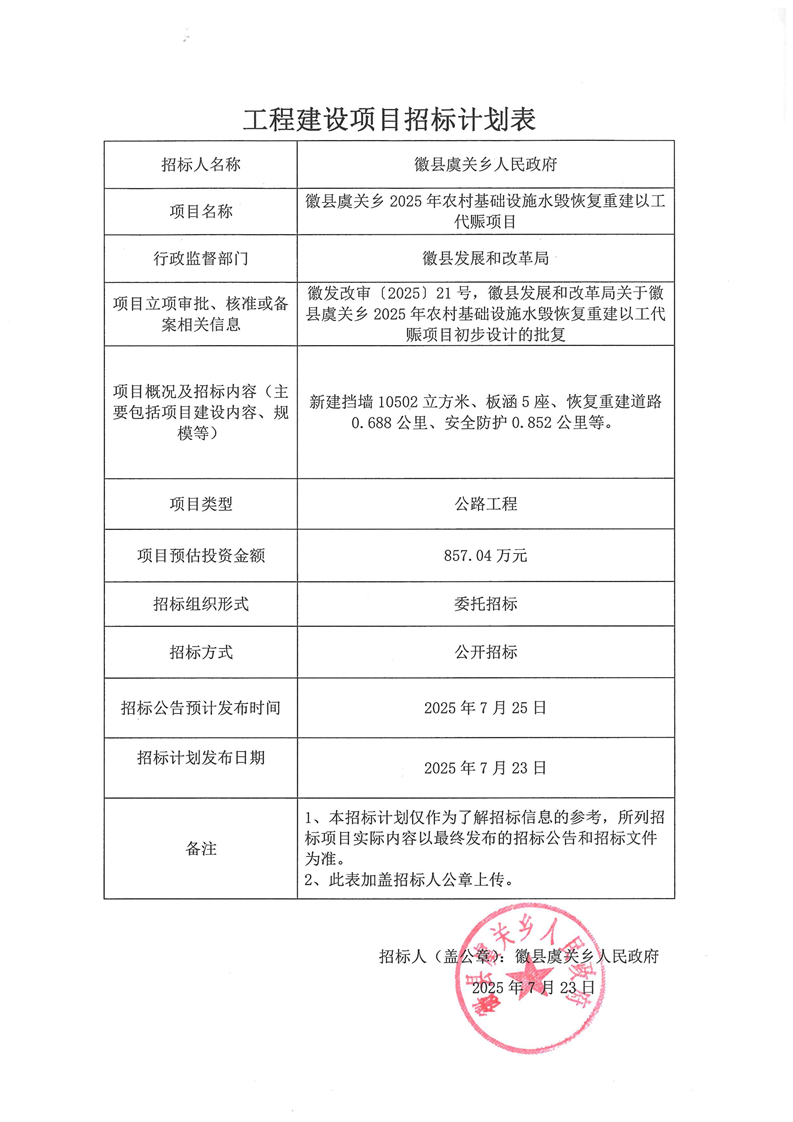 徽縣虞關鄉(xiāng)2025年農(nóng)村基礎設施水毀恢復重建以工代賑項目