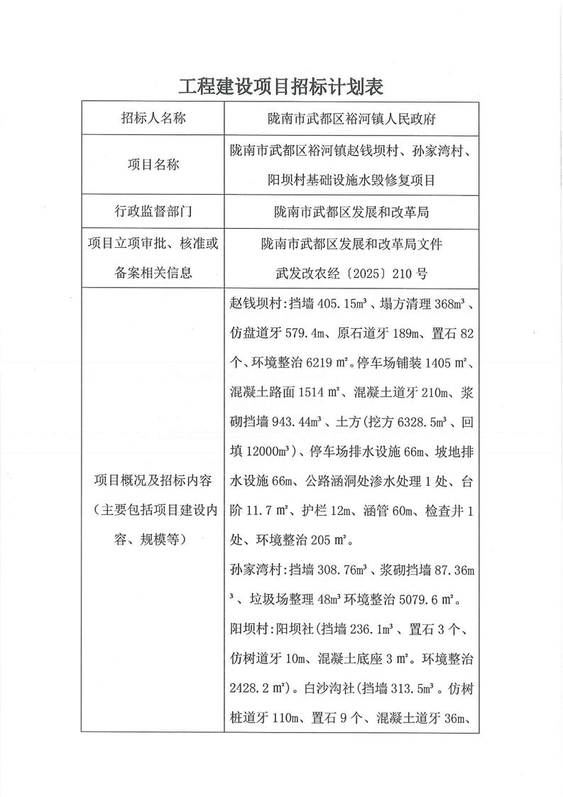 隴南市武都區裕河鎮趙錢壩村、孫家灣村、陽壩村基礎設施水毀修復項目