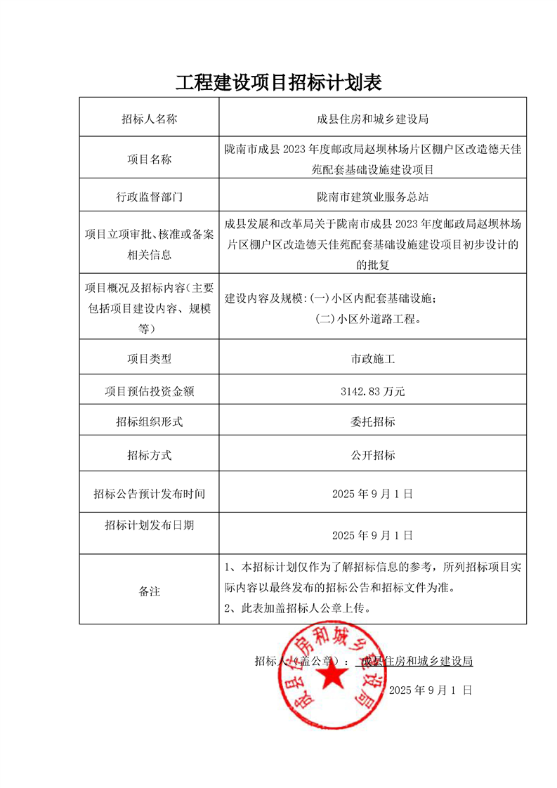 隴南市成縣2023年度郵政局趙壩林場片區棚戶區改造德天佳苑配套基礎設施建設項目