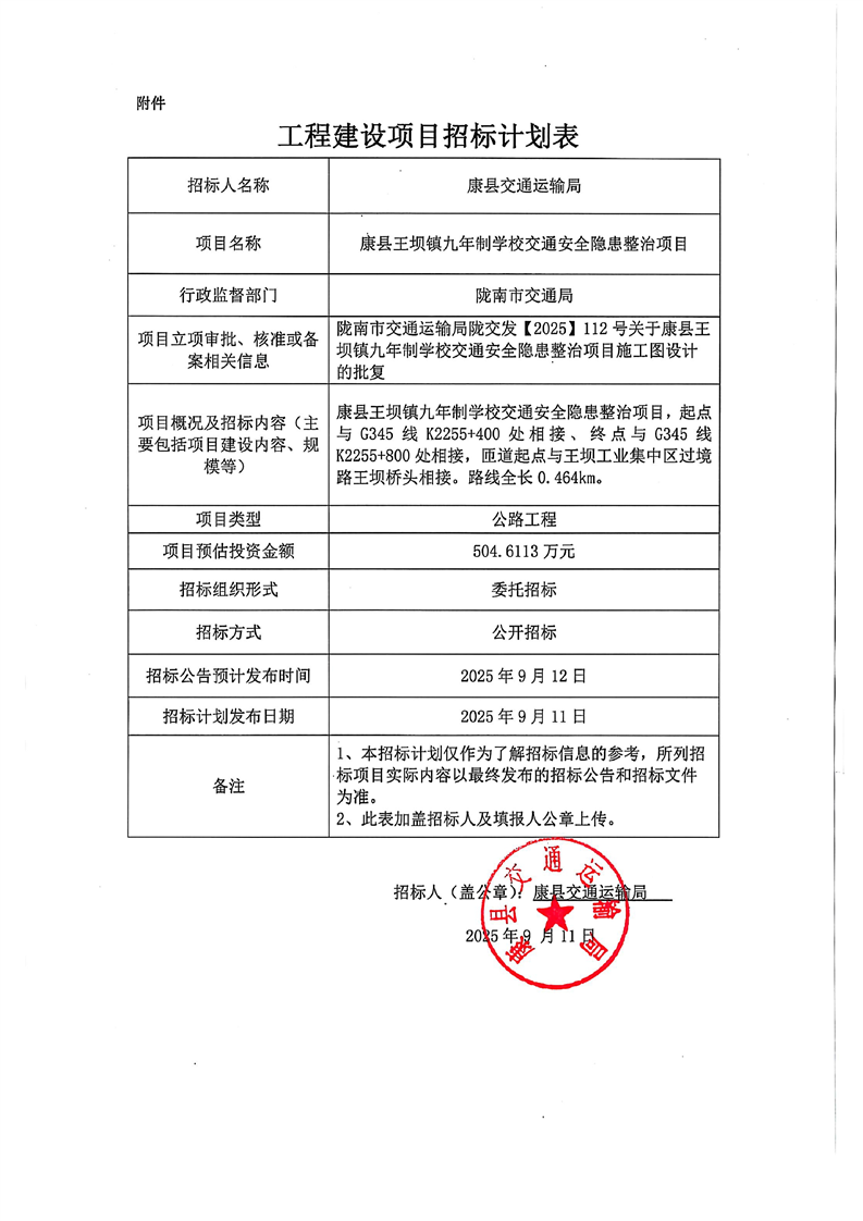康縣王壩鎮九年制學校交通安全隱患整治項目