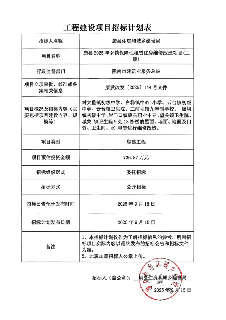 康縣2025年鄉鎮保障性租賃住房維修改造項目(二期)