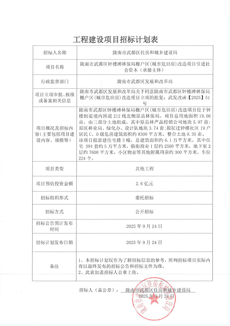 隴南市武都區鐘樓灘林保局棚戶區(城市危舊房)改造項目引進社會資本(承接主體)