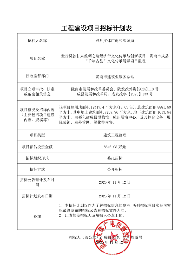 工程建設項目招標計劃表世行貸款甘肅絲綢之路經濟帶文化傳承與創新項目--隴南市成縣“千年古縣”文化傳承展示項目監理.pdf