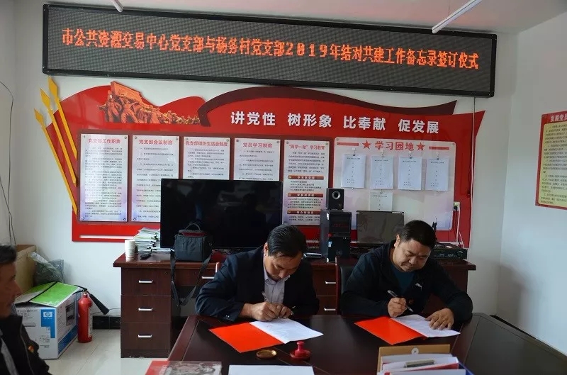 根據(jù)《中共隴南市委組織部關(guān)于扎實做好幫扶單位黨組織與貧困村黨組織結(jié)對攻堅工作的通知》要求,市公共資源交易中心黨支部與武都區(qū)黃坪鎮(zhèn)楊務(wù)村黨支部在4月啟動開展結(jié)對共建活動基礎(chǔ)上,組織召開雙方黨支部結(jié)對共建工作聯(lián)席會,進(jìn)一步探討和完善結(jié)對共建方案,簽訂了《隴南市公共資源交易中心黨支部與武都區(qū)黃坪鎮(zhèn)楊務(wù)村黨支部2019年結(jié)對共建工作備忘錄》。